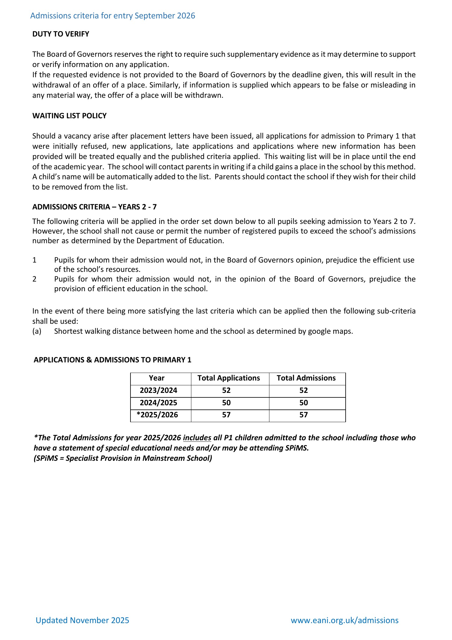 Admissions Criteria for September Entry 2026